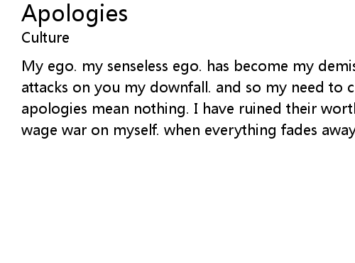 | My ego. my senseless ego. has become my demise. my relentless, still senseless attacks on you my downfall. and so my need to conquer...conquers me. My apologies mean nothing. I have ruined their worth. Again on the wrong path as i wage war on myself. when everything fades away. |
