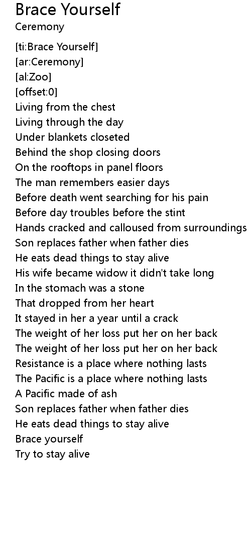 | [01:30.65] | Hands cracked and calloused from surroundings |