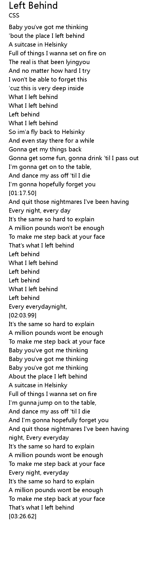 | [01:56.76] | Left behind |