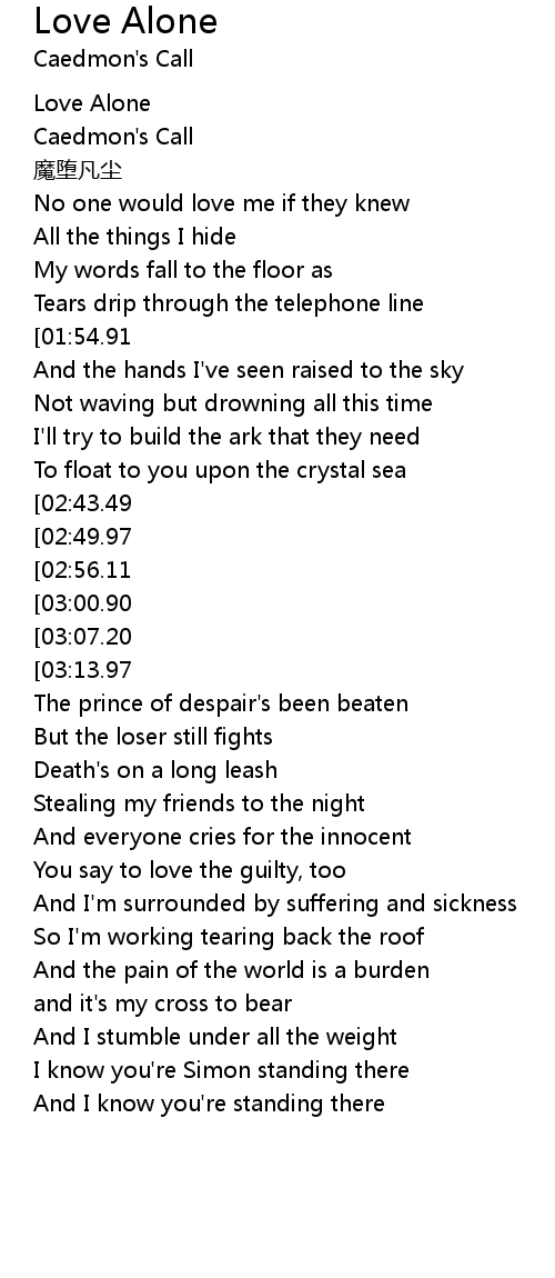 | [04:12.29][02:49.97][01:21.73] | 'Cause I can't stand to love alone |
