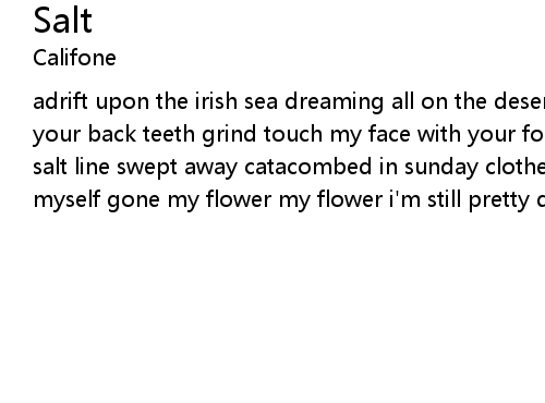 | adrift upon the irish sea dreaming all on the desert flats smash the atom with your back teeth grind touch my face with your foot long tone swept away the salt salt line swept away catacombed in sunday clothes gathering the wood to burn myself gone my flower my flower i'm still pretty drunk on easter day |
