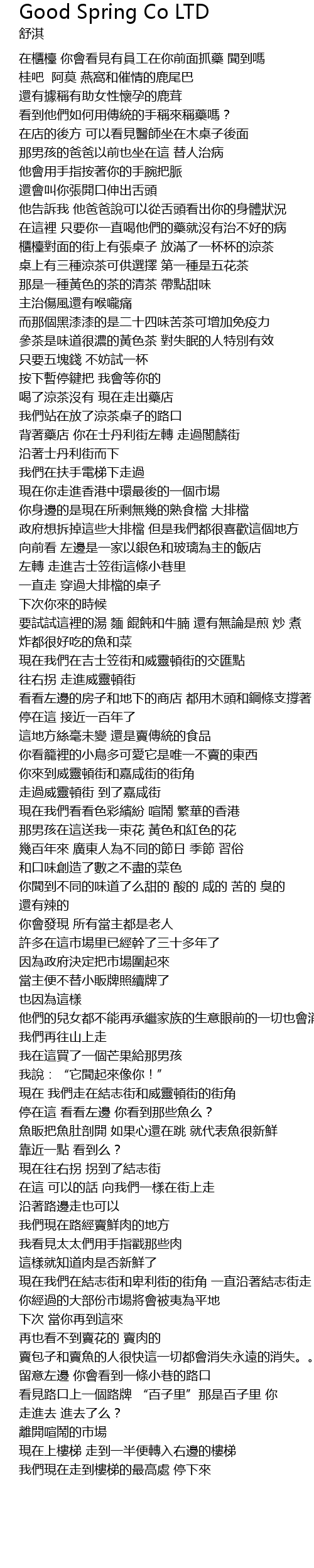 | [02:24.53] | 我們在扶手電梯下走過 現在你走進香港中環最後的一個市場 |