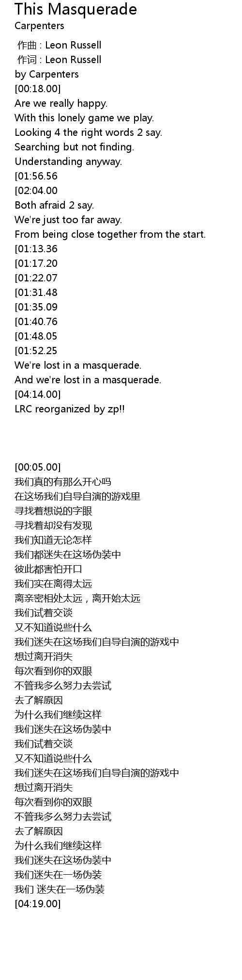 | [03:42.64][01:56.56][00:48.05] | We' re lost in this masquerade. |