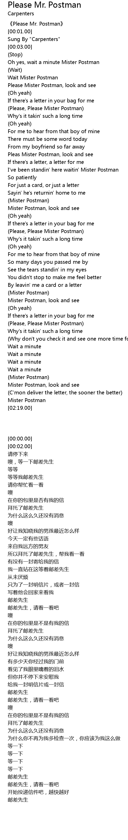 | [00:29.00] | Pleas Mister Postman, look and see |