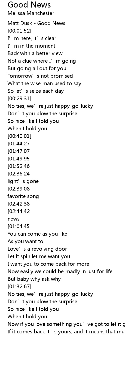 | [03:07.56][02:44.42][02:03.94][01:00.35] | Baby you' re good news, you' re good news |