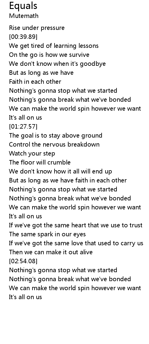 | [01:13.01] | Nothing's gonna break what we've bonded |