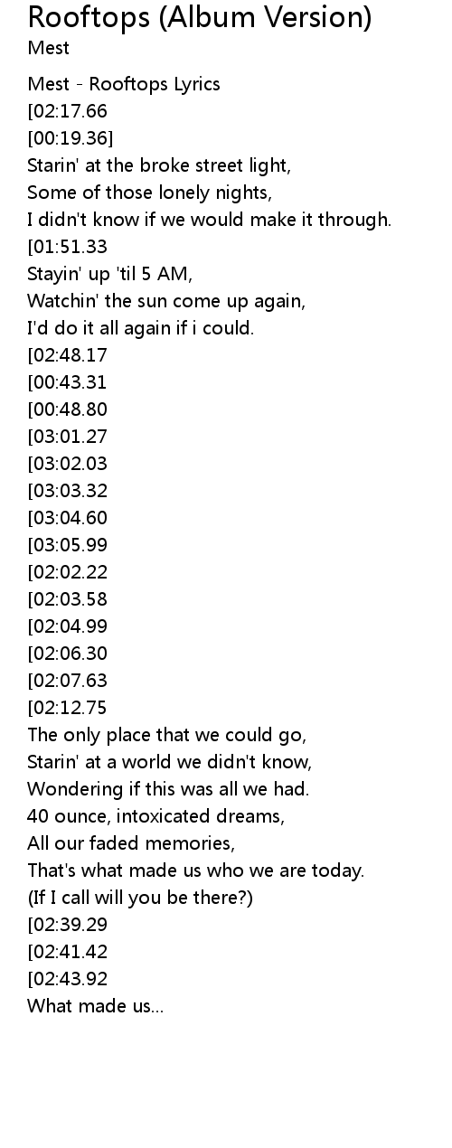 | [00:00.77] | Mest - Rooftops Lyrics |