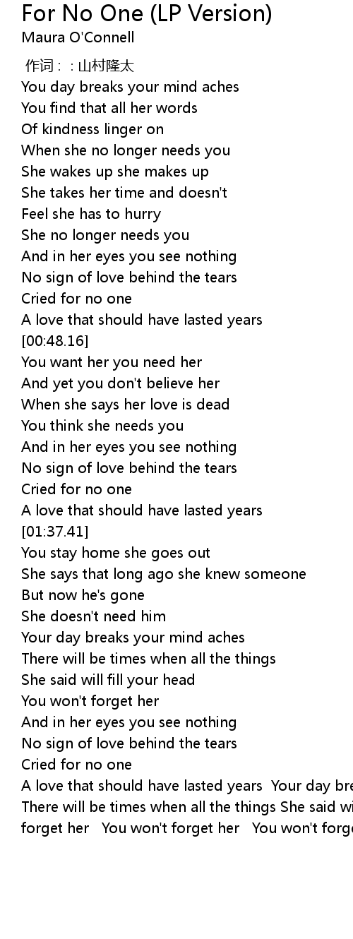 | [00:40.60] | Cried for no one |