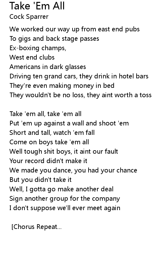 Take 'em all, watch 'em fall [x4] [Chorus Repeat...] |