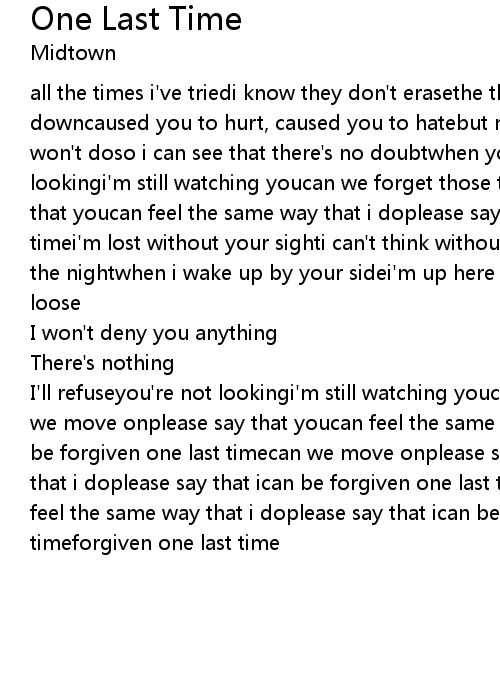 all the times i've triedi know they don't erasethe things that brought me downcaused you to hurt, caused you to hatebut now i've figured outall that we won't doso i can see that there's no doubtwhen you say i knowyou're not lookingi'm still watching youcan we forget those timescan we move onplease say that youcan feel the same way that i doplease say that ican be forgiven one last timei'm lost without your sighti can't think without your mindthere's comfort in the nightwhen i wake up by your sidei'm up here on my ownwith nothing left to loose |