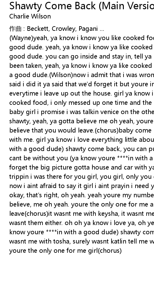 | (Wayne)yeah, ya know i know you like cooked food, ya know youre ****in with a good dude. yeah, ya know i know ya like cooked food, ya know youre ****in with a good dude. you can go inside and stay in, tell ya home boy youre stayin youve been taken, yeah, ya know i know ya like cooked food, ya know youre ****in with a good dude.(Wilson)now i admit that i was wrong from the beginning, yeah, i said i did it ya said that we'd forget it but youre in my head askin who's there everytime i leave up out the house. girl ya know im a good dude, knows you like cooked food, i only messed up one time and the other day when you was callin baby girl i promise i was talkin venice on the other line. you my number one shawty, yeah, ya gotta believe me oh yeah, youre the only one for me and i cant believe that you would leave.(chorus)baby come back, oh ya know i need you here with me. girl ya know i love everything little about you (ya know youre ****in with a good dude) shawty come back, you can put it all on me i was wrong and i cant be without you (ya know youre ****in with a good dude)baby come backdont forget the big picture gotta house and car with ya when ya family started trippin i was there for you girl, you girl, only you girl, do you remember that? now i aint afraid to say it girl i aint prayin i need you in my life. uh hu, okay, that's right, oh yeah. yeah youre my number one shawty, yeah ya gotta believe, me oh yeah. youre the only one for me and i cant believe that you would leave(chorus)it wasnt me with keysha, it wasnt me with lisa, shonna or tamika it wasnt them either. oh oh ya know i love ya, oh yeah, no one above you girl (ya know youre ****in with a good dude) shawty come back. ya know it wasnt randa, wasnt me with tosha, surely wasnt katlin tell me why their hatin on me girl, youre the only one for me girl(chorus) |