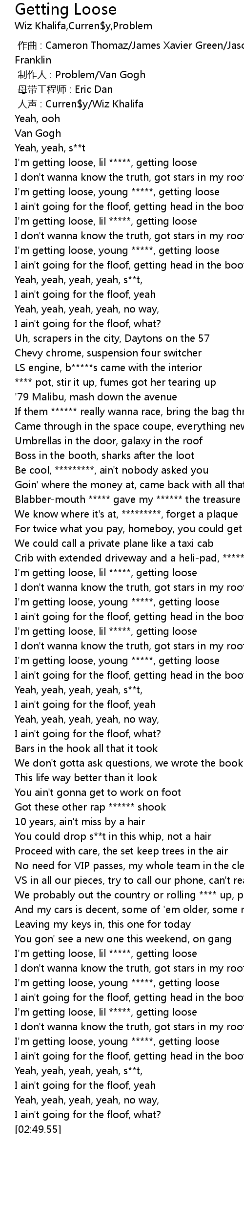 | [02:21.50] | I'm getting loose, lil *****, getting loose |