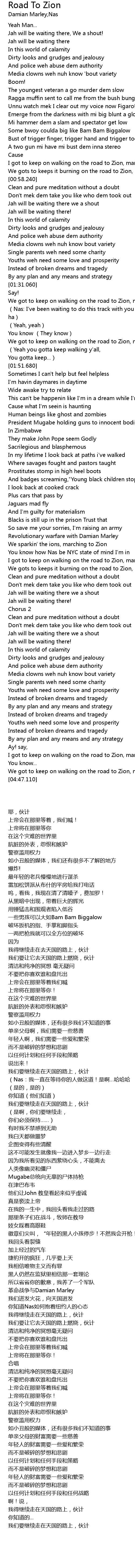 | [04:37.490] | We got to keep on walking on the road to Zion, man |