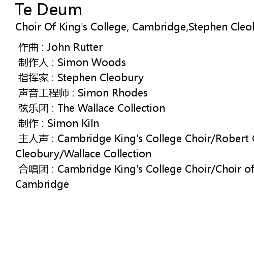 | [00:00.000] | 主人声 : Cambridge King's College Choir/Robert Quinney/Stephen Cleobury/Wallace Collection |