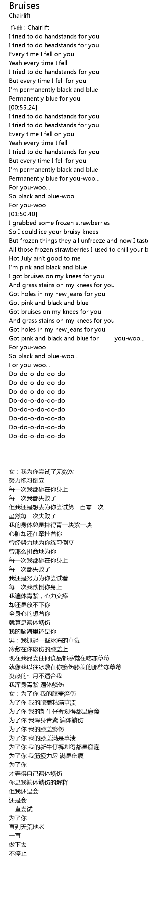 | [02:17.24] | All those frozen strawberries I used to chill your bruisy knees |