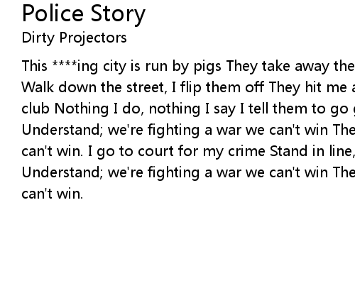 | This ****ing city is run by pigs They take away the rights from all the kids Walk down the street, I flip them off They hit me across the head with a billy club Nothing I do, nothing I say I tell them to go get ****ed, they put me away Understand; we're fighting a war we can't win They hate us, we hate them. we can't win. I go to court for my crime Stand in line, pay bail, I may serve time Understand; we're fighting a war we can't win They hate us, we hate them. we can't win. |