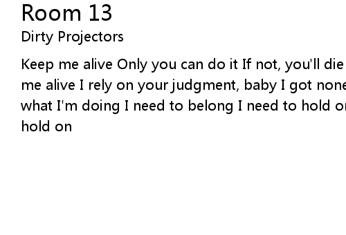 | Keep me alive Only you can do it If not, you'll die too And I'll see to it Keep me alive I rely on your judgment, baby I got none left of my own I don't know what I'm doing I need to belong I need to hold on I need to belong I need to hold on |