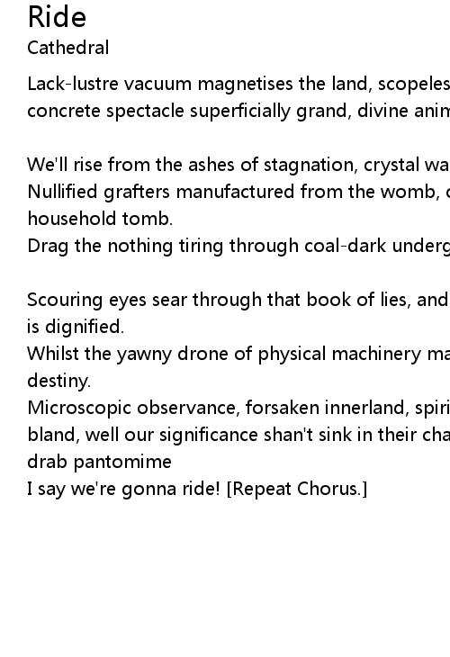 Lack-lustre vacuum magnetises the land, scopeless material in ruthless demand, concrete spectacle superficially grand, divine animation buried in sight. [Chorus:] |