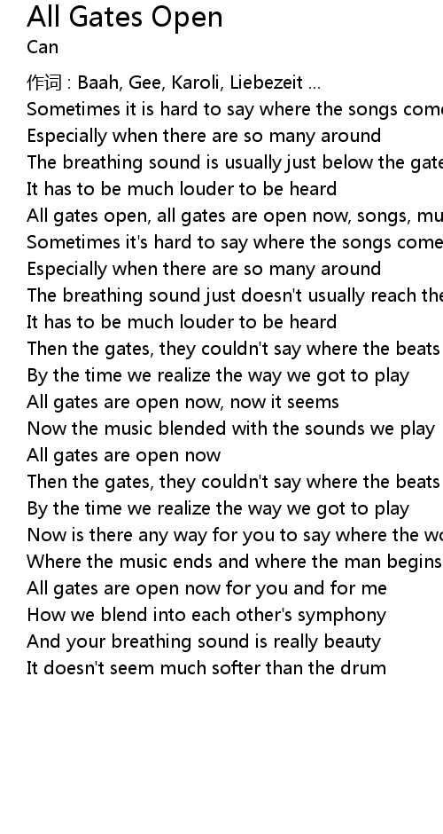 | All gates open, all gates are open now, songs, music | |