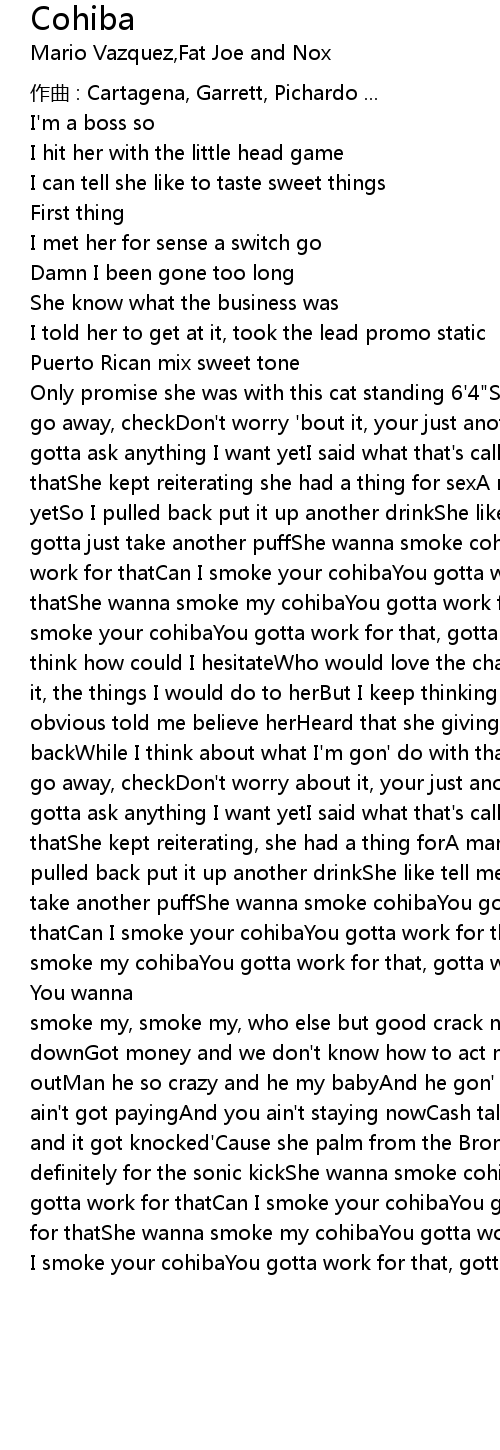 | Only promise she was with this cat standing 6'4"She said I ride my own, check, go away, checkDon't worry 'bout it, your just another pay, checkShe said I ain't gotta ask anything I want yetI said what that's called when you move it like thatShe kept reiterating she had a thing for sexA man and another man she tried, yetSo I pulled back put it up another drinkShe like tell me what you think, gotta just take another puffShe wanna smoke cohibaYou gotta work for that, gotta work for thatCan I smoke your cohibaYou gotta work for that, gotta work for thatShe wanna smoke my cohibaYou gotta work for that, gotta work for thatCan I smoke your cohibaYou gotta work for that, gotta work for thatShe told me not to think how could I hesitateWho would love the chance just to give it to meI knew it, the things I would do to herBut I keep thinking me him and herBut the obvious told me believe herHeard that she giving me the feverSlow up ma and kick backWhile I think about what I'm gon' do with thatShe said I ride my own, check, go away, checkDon't worry about it, your just another pay, checkShe said I ain't gotta ask anything I want yetI said what that's called when you move it like thatShe kept reiterating, she had a thing forA man and another man she triedSo I pulled back put it up another drinkShe like tell me what you think, got to just take another puffShe wanna smoke cohibaYou gotta work for that, gotta work for thatCan I smoke your cohibaYou gotta work for that, gotta work for thatShe wanna smoke my cohibaYou gotta work for that, gotta work for thatCan I smoke your cohibaYou gotta work for that, gotta work for that[Foreign content]You wanna smoke my, smoke my, who else but good crack nowWant a made back with a hat downGot money and we don't know how to act nowAll talk puff this 'til we pass outMan he so crazy and he my babyAnd he gon' pay me nowHe sound crazy 'cause he ain't got payingAnd you ain't staying nowCash talk with a projectFat in a palm and it got knocked'Cause she palm from the Bronx with the hardest liftYeah, definitely for the sonic kickShe wanna smoke cohibaYou gotta work for that, gotta work for thatCan I smoke your cohibaYou gotta work for that, gotta work for thatShe wanna smoke my cohibaYou gotta work for that, gotta work for thatCan I smoke your cohibaYou gotta work for that, gotta work for that |