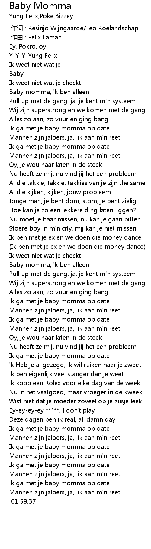 | [00:57.86] | Baby momma, 'k ben alleen |