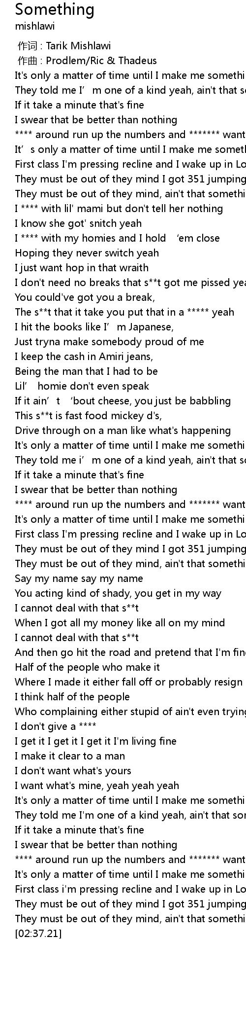 | [01:36.51] | They must be out of they mind, ain't that something |