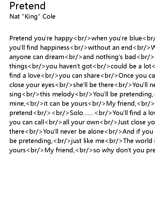 Pretend you're happy<br/>when you're blue<br/>It isn't very hard to do<br/>And you'll find happiness<br/>without an end<br/>Whenever you pretend<br/>Remember anyone can dream<br/>and nothing's bad<br/>as it may seem<br/>The little things<br/>you haven't got<br/>could be a lot<br/>if you'd pretend<br/>You'll find a love<br/>you can share<br/>Once you can call<br/>all your own<br/>Just close your eyes<br/>she'll be there<br/>You'll never be alone<br/>And if you sing<br/>this melody<br/>You'll be pretending,<br/>just like me<br/>the world is mine,<br/>it can be yours<br/>My friend,<br/>so why don't you pretend<br/><br/>Solo.......<br/>You'll find a love<br/>you can share<br/>Once you can call<br/>all your own<br/>Just close your eyes<br/>she'll be there<br/>You'll never be alone<br/>And if you sing<br/>this melody<br/>You'll be pretending,<br/>just like me<br/>The world is mine,<br/>it can be yours<br/>My friend,<br/>so why don't you pretend<br/><br/><br/> |
