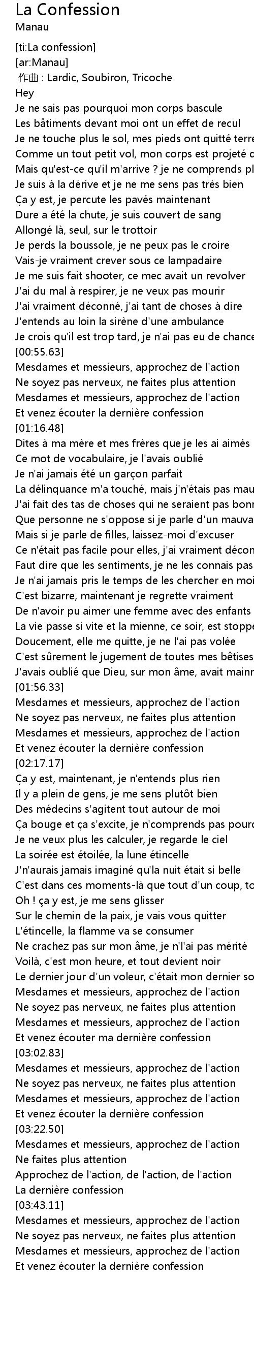 | [01:10.48] | Et venez e couter la dernie re confession |