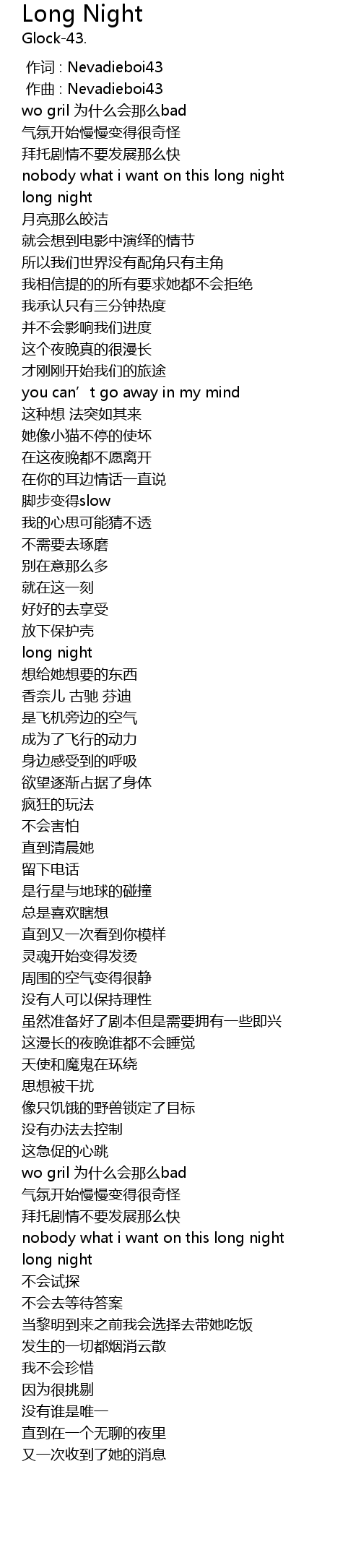 | [01:11.326] | zhe ge ye wan zhen de hen man chang |