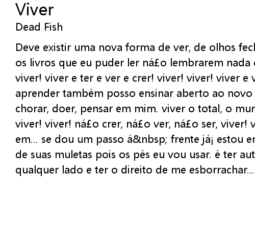 | Deve existir uma nova forma de ver, de olhos fechados poder entender. se todos os livros que eu puder ler ná o lembrarem nada e eu ná o conseguir viver! viver! viver e ter e ver e crer! viver! viver! viver e ver em.... se posso aprender també m posso ensinar aberto ao novo e nunca cristalizar gritar, chorar, doer, pensar em mim. viver o total, o mundo é e ná o é teu. viver! viver! viver! ná o crer, ná o ver, ná o ser, viver! viver! viver e ver em... se dou um passo á nbsp frente já estou em outro lugar. ná o preciso de suas muletas pois os pé s eu vou usar. é ter autonomia pra guiar, olhar pra qualquer lado e ter o direito de me esborrachar... |