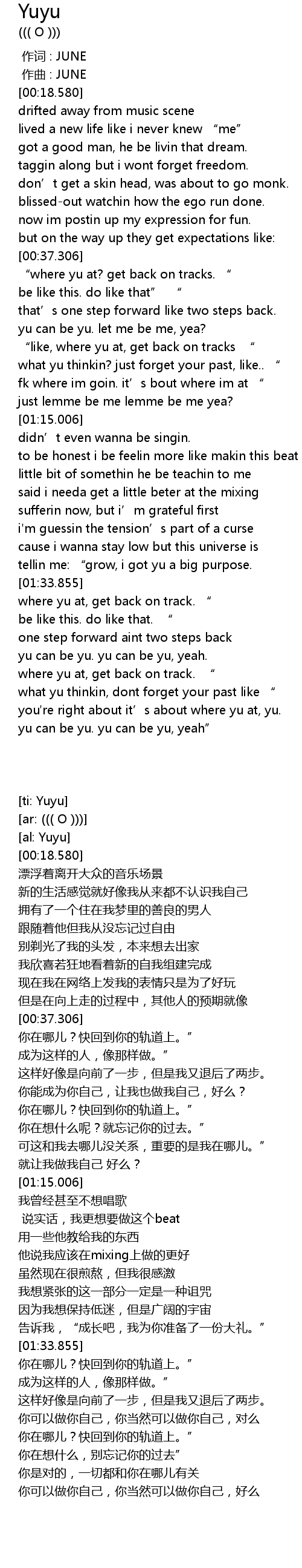 | [01:36.362] | where yu at, get back on track. “ |