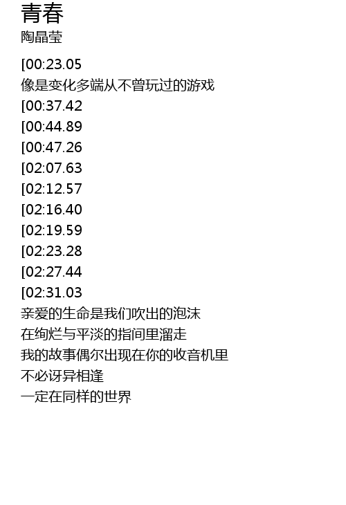 | [02:55.25][02:07.63][00:53.27] | 青春过了一半 |