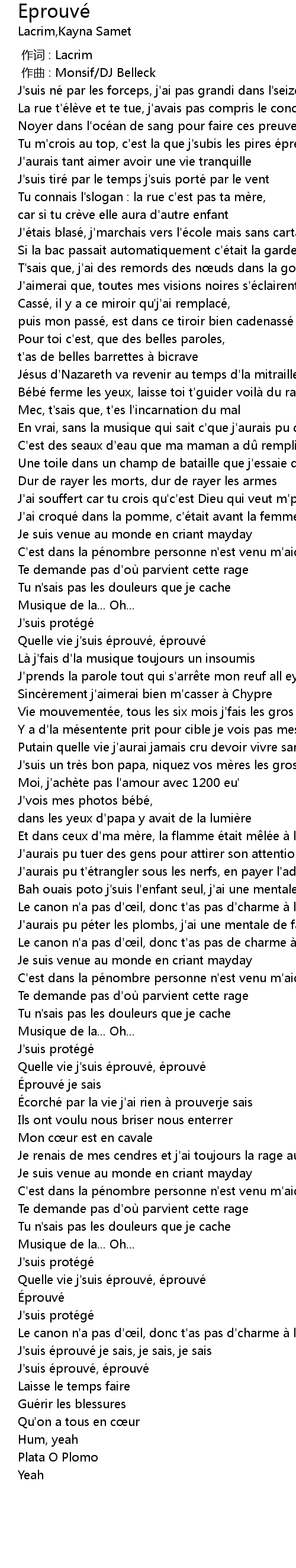 | [01:44.11] | Quelle vie j'suis éprouvé, éprouvé |