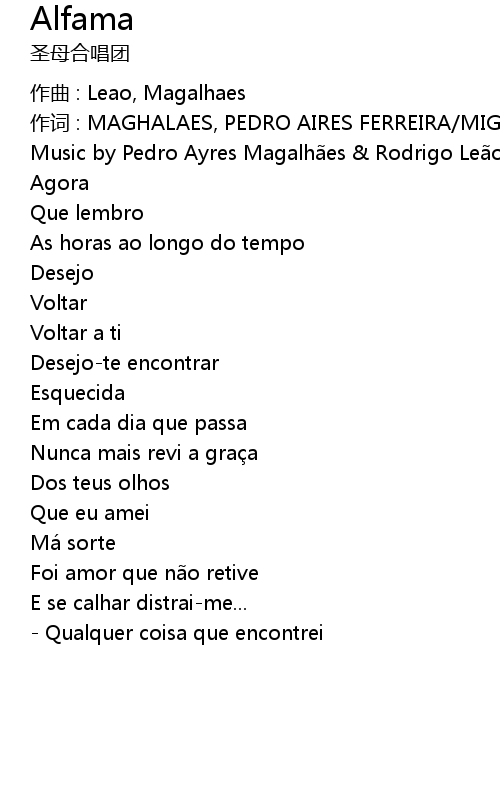 | 作词 : MAGHALAES, PEDRO AIRES FERREIRA/MIGUEZ, RODRIGO DA COSTA LEA | |