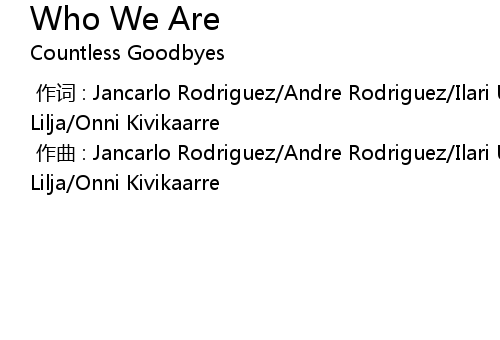 | [00:00.000] | 作词 : Jancarlo Rodriguez/Andre Rodriguez/Ilari Ukkola/Lauri Lilja/Onni Kivikaarre |