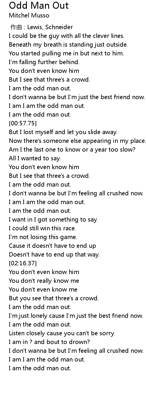 | [02:39.27] | I'm just lonely cause I'm just the best friend now. |