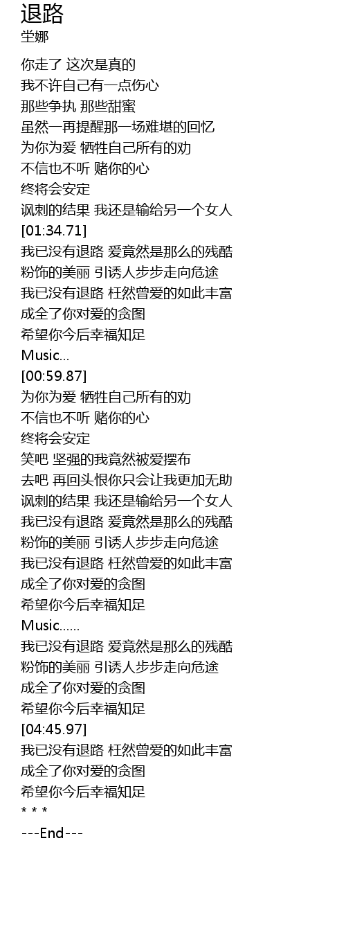 | [04:25.74] | 我已没有退路 枉然曾爱的如此丰富 |
