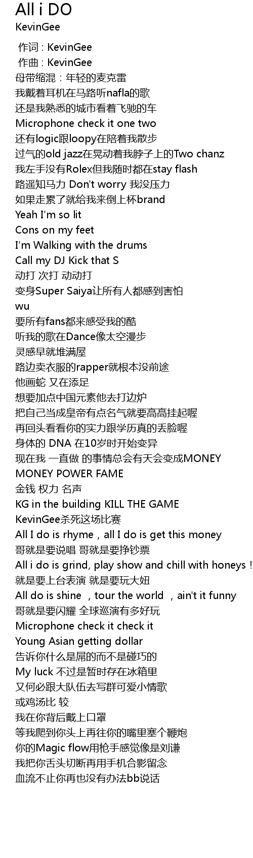 | [01:23.201] | All I do is rhyme,all I do is get this money |