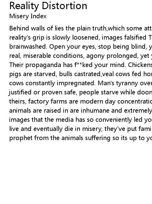 Behind walls of lies the plain truth,which some attempt to deny and hide, reality's grip is slowly loosened, images falsified The media shit has you brainwashed. Open your eyes, stop being blind, you clearly see the horrors are real, miserable conditions, agony prolonged, yet you ignore the pain they feel. Their propaganda has f**ked your mind. Chickens debeaked, chicks are smothered, pigs are starved, bulls castrated,veal cows fed hormones, antibiotics, female cows constantly impregnated. Man's tyranny over other living beings cannot be justified or proven safe, people starve while doomed cows eat what could be theirs, factory farms are modern day concentration camps. The conditions these animals are raised in are inhumane and extremely cruel, forget these fairytale images that the media has so conveniently led you to beleive, they are reared to live and eventually die in misery, they've put family farms out of business, you prophet from the animals suffering so its up to you and I to stop the torture!!!
