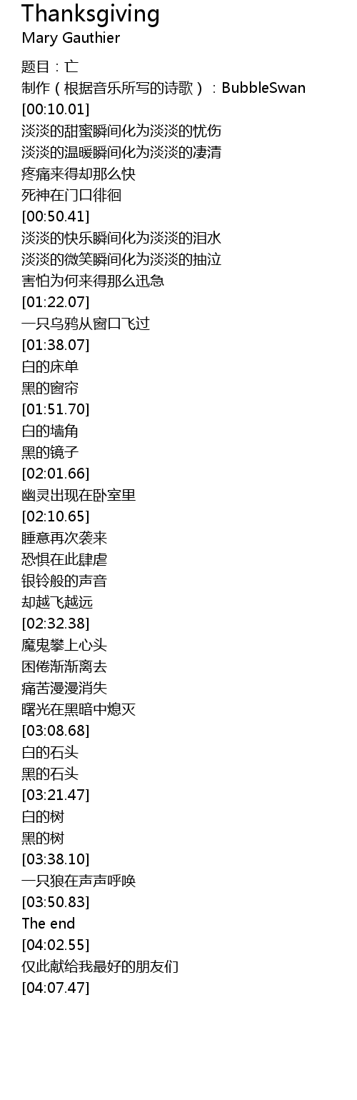 | [00:06.39] | 制作(根据音乐所写的诗歌):BubbleSwan |