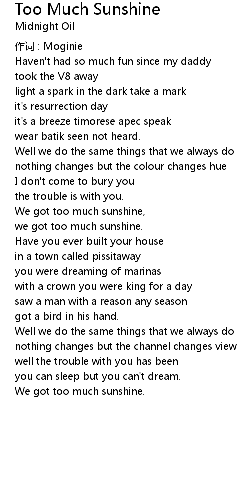 | 歌曲 | Too Much Sunshine |
