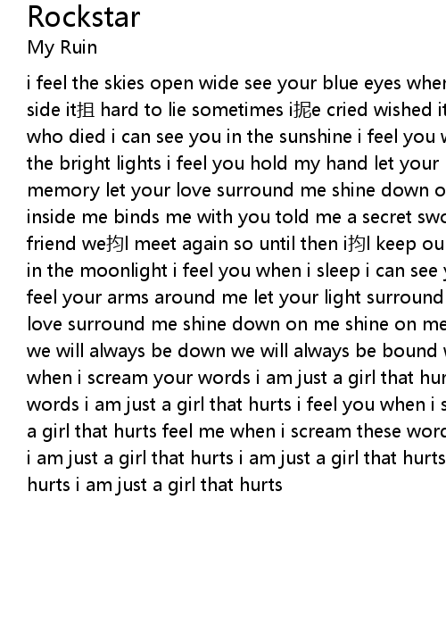 | i feel the skies open wide see your blue eyes when worlds collide you zhen e by my side it zha hard to lie sometimes i ni e cried wished it was me wished it was me who died i can see you in the sunshine i feel you where i stand i can see you in the bright lights i feel you hold my hand let your light surround me in loving memory let your love surround me shine down on me shine on me something so deep inside me binds me with you told me a secret swore that i yun keep it someday my friend we yun l meet again so until then i yun l keep our secret safe i can see you in the moonlight i feel you when i sleep i can see you on those dark nights i feel your arms around me let your light surround me in loving memory let your love surround me shine down on me shine on me rockstar we will always be bound we will always be down we will always be bound we will always be down i feel you when i scream your words i am just a girl that hurts feel me when i scream these words i am just a girl that hurts i feel you when i scream your words i am just a girl that hurts feel me when i scream these words i am just a girl that hurts i am just a girl that hurts i am just a girl that hurts i am just a girl that hurts i am just a girl that hurts |