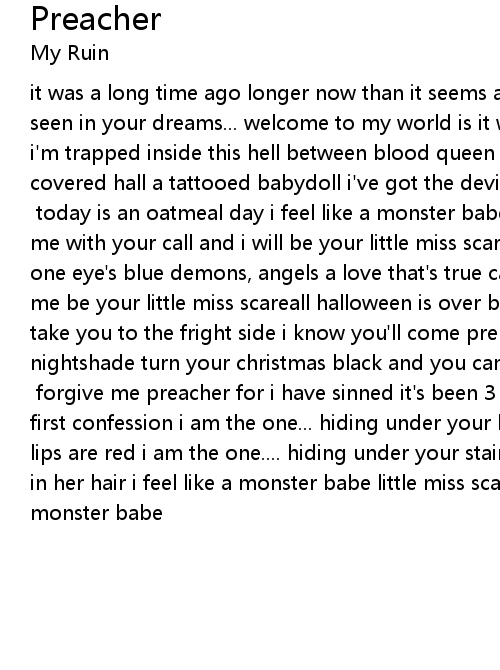 it was a long time ago longer now than it seems a place that perhaps you have seen in your dreams... welcome to my world is it what you thought it would be? i'm trapped inside this hell between blood queen and purgatory a coop filled covered hall a tattooed babydoll i've got the devil in my corner and jesus on my wall [chorus] today is an oatmeal day i feel like a monster babe preacher save me with your call and i will be your little miss scareall one eye's green and one eye's blue demons, angels a love that's true catch me as i start to fall let me be your little miss scareall halloween is over but i will keep you scared take you to the fright side i know you'll come prepared by your deadly nightshade turn your christmas black and you can be my johnny homicidal maniac [repeat chorus] forgive me preacher for i have sinned it's been 3 weeks since my first confession i am the one... hiding under your bed my teeth are sharp, my lips are red i am the one.... hiding under your stairs with snakes and spiders in her hair i feel like a monster babe little miss scareall i feel like a monster babe |