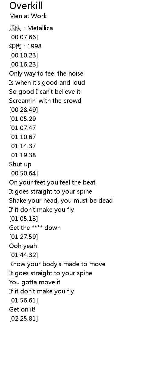 | [02:11.89][01:19.38][00:44.00] | Overkill |