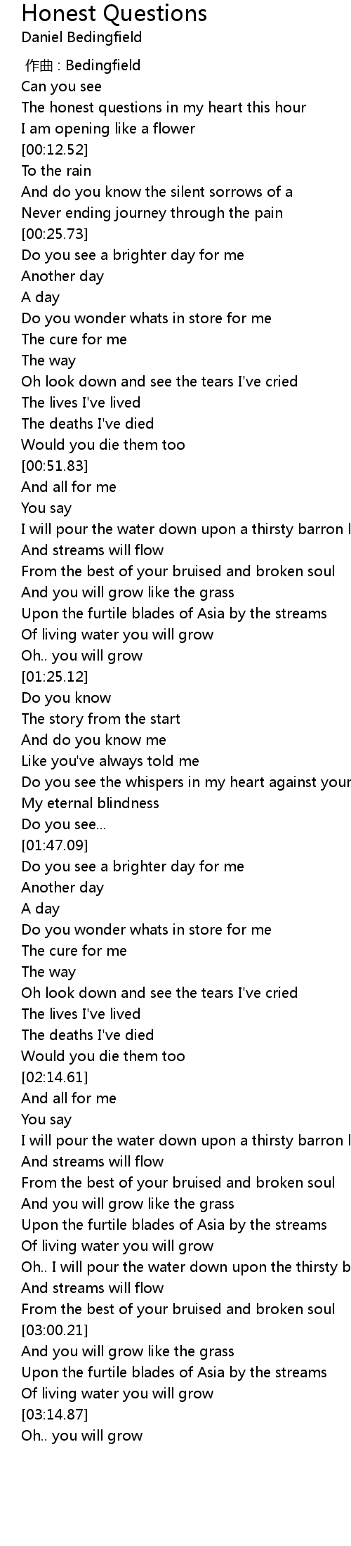 | [00:03.47] | The honest questions in my heart this hour |
