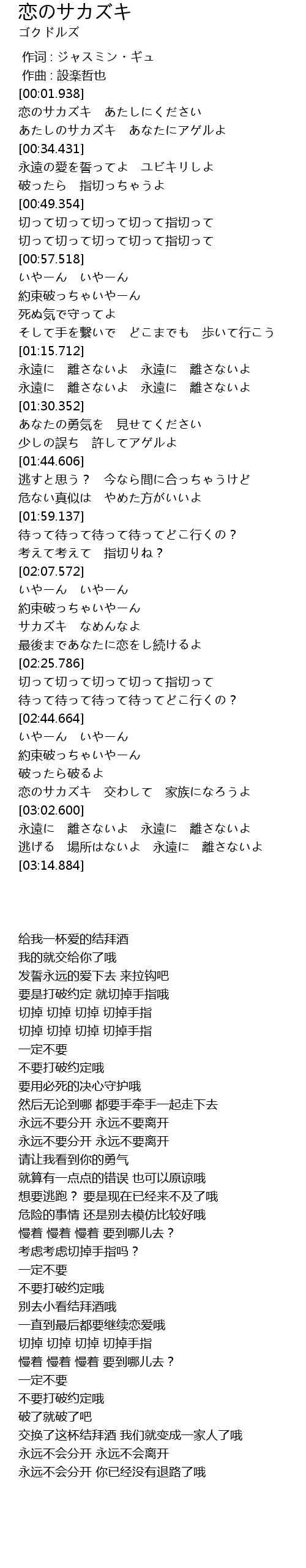 | [00:35.474] | 永遠の愛を誓ってよ ユビキリしよ |