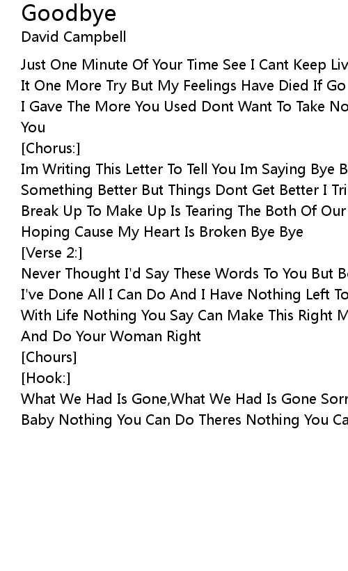 Im Writing This Letter To Tell You Im Saying Bye Bye (Bye Bye)I Hoped For Something Better But Things Dont Get Better I Tried Ooh Ooh I Tried See This Break Up To Make Up Is Tearing The Both Of Our Lives And There's No Use In Hoping Cause My Heart Is Broken Bye Bye