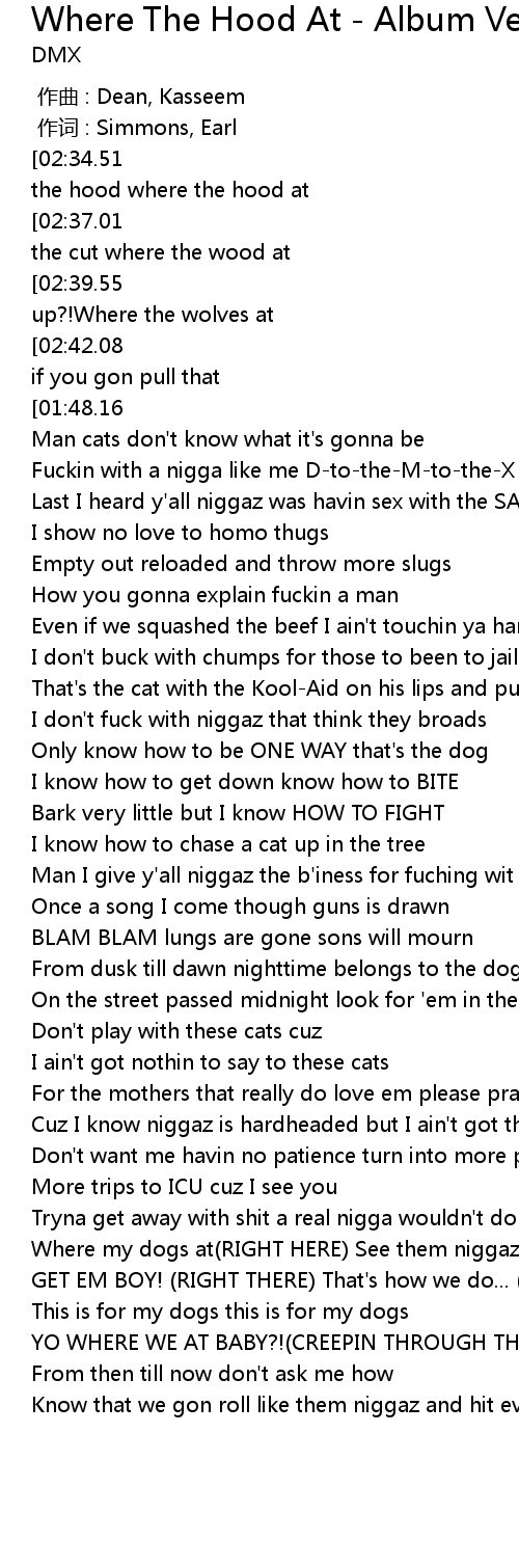 | [02:44.72][02:34.51][01:37.94][01:27.85][00:31.19][00:21.02] | Where the hood where the hood where the hood at |