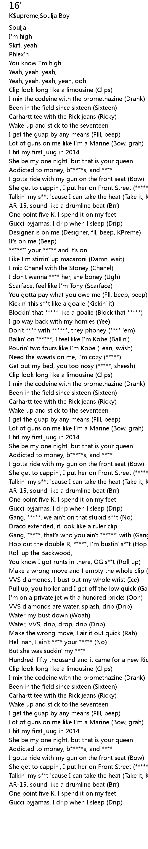 | [00:55.44] | Blockin' that ***** like a goalie (Block that *****) |