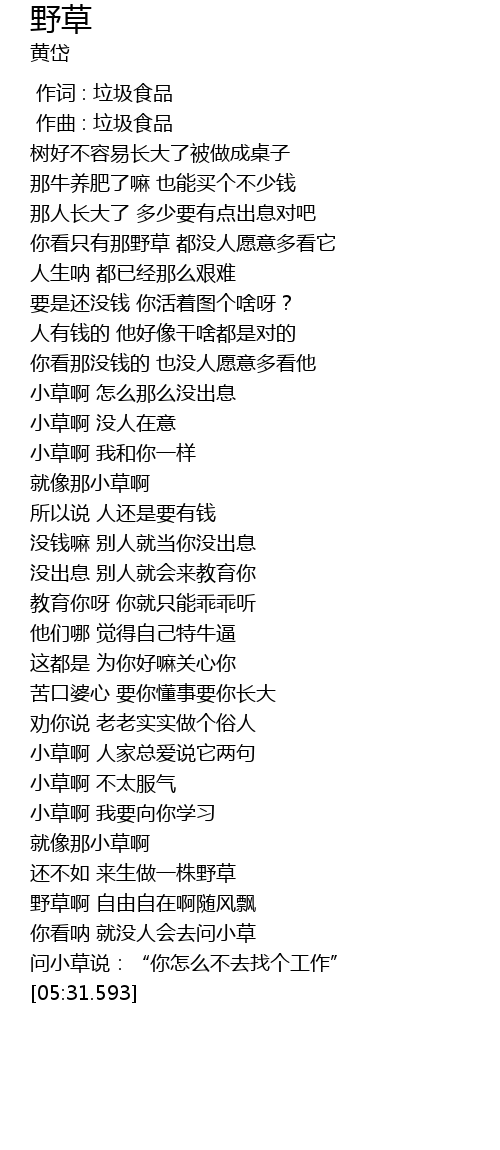 | [04:53.633] | 野草啊 自由自在啊随风飘 |